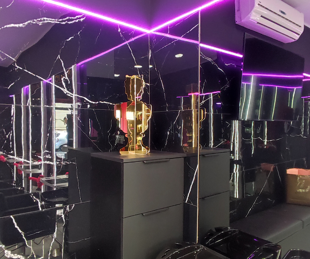 Il locale planimetricamente è suddiviso in varie zone delimitate da portali magenta illuminati per scandire il passaggio da un'area all'altra. Al piano superiore il centro estetico dotato di area relax e cabine per i vari trattamenti.