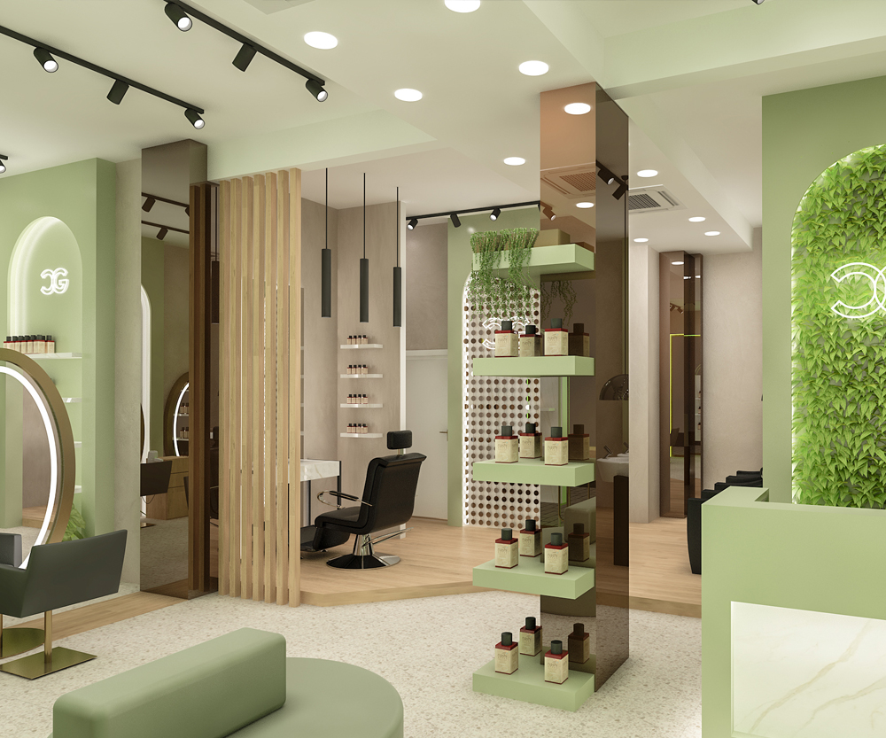 La scelta progettuale è stata di avere un unico locale aperto senza separazioni tra gli ambienti, le varie zone di lavoro sono separate da doghe verticali, da specchi a mezza altezza o da tende.